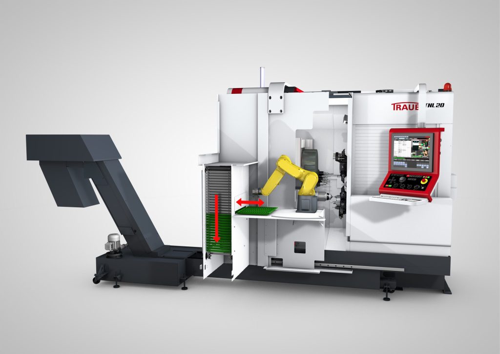 To assist unattended machining of blank shafts or preformed blanks, a robot cell is integrated into the front of the machine. The robot cell and TNL20 are designed as a unit, and delivered as such.