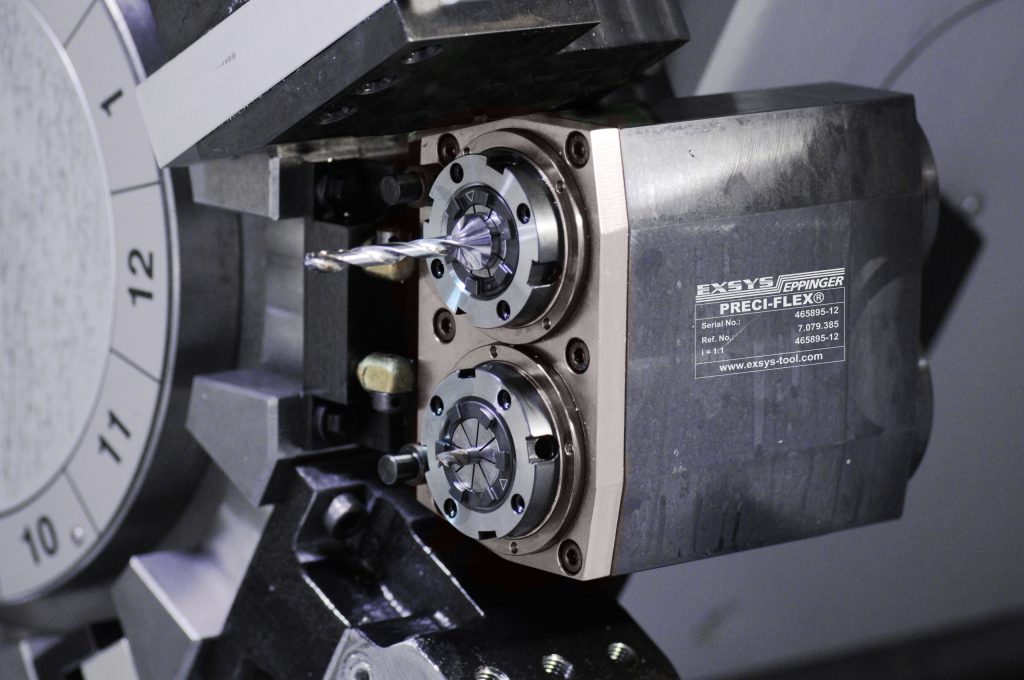 Available in Horizontal (H) type 90-degree radial holders and Vertical (V) type straight off-set axial holders, the PRECI-FLEX double-collet chuck provides repeatability within 5 microns. The tooling system features an EXSYS/EPPINGER compensating clutch with a floating coupling between turret drive motor tangs and toolholders that automatically compensates for misalignment. The resulting high precision reduces vibration and tool chatter for longer tool life and better surface finishes.