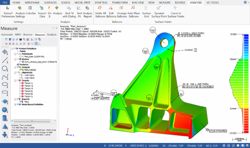 Power Surface - A new Verisurf capability that fills holes in CAD models with arbitrary boundaries and fits a CAD surface through point clouds or meshes. Power Surface includes an extensive set of fine tuning controls for that provide the user with total flexibility over resulting surface profiles and boundaries. Power Surface even displays statistical metrics characterizing the quality and fit of surfaces created. Power Surface vastly improves that ability of operators to accelerate the creation of high-quality, manufacturable, solid models from scan data, mesh data, or derived from existing CAD models.