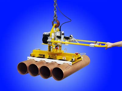 The Anver VPFL4 Vacuum Lifter for heavy pipe and tube features nylon centering guides and oval rubber suction cups to prevent anything other than nylon or rubber from touching the load. Designed to compensate for unevenly packed loads with staggered rows, it has a 500 lb. capacity and can pick up 2, 3, or 4 pipes or tubes from the top simultaneously.
