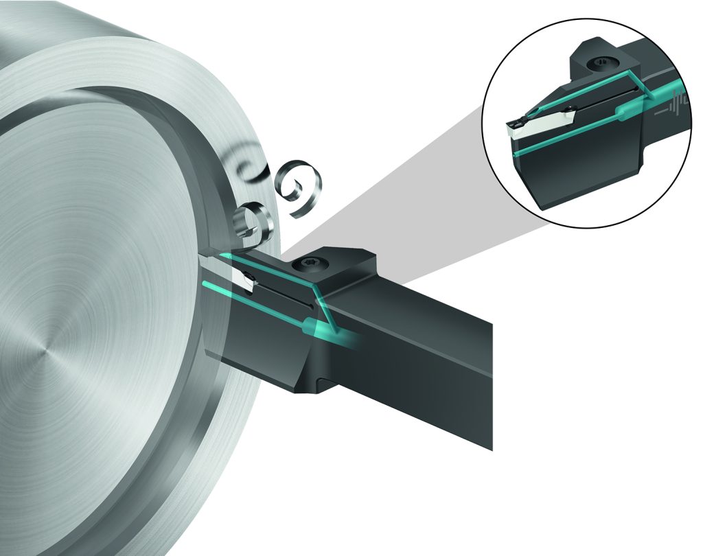 The system handles axial grooves from dia. 2.362-in (60 mm), cutting depths up to 1.299-in (33 mm), with insert width of 0.197-in (5 mm). The new system delivers maximum productivity and cutting parameters due to optimal cooling, strength and controlled chip breaking, along with high cost-efficiency due to two cutting edges. Axial grooving is effective when the groove depth is 1.5 times greater than the groove width, but to be successful axial grooving requires dedicated tooling and a dedicated chip control insert.