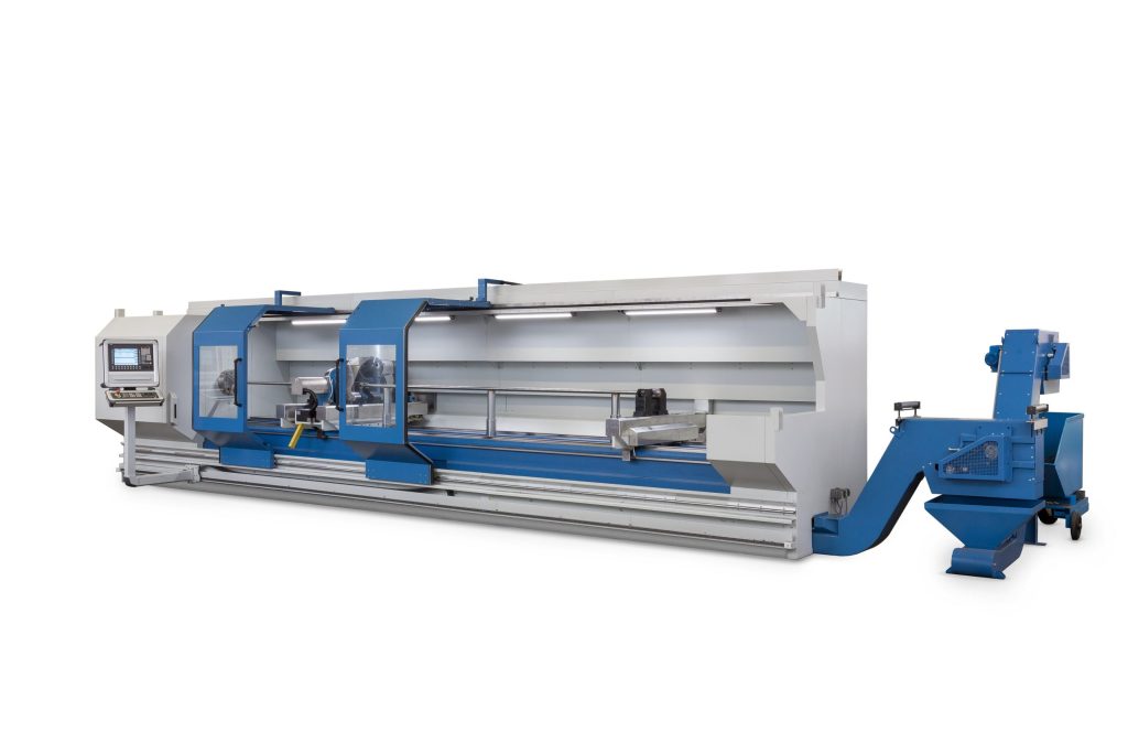 The 90° chip conveyor removes the chips from the spindle axis and additionally facilitates through-loading of material in order to whirl spindles of any length using the repositioning process. Integrated measuring systems monitor the fitting in the already whirled thread during repositioning. In addition, the whirling attachments can be equipped with a controlled A-axis (inclination adjustment), so that the angle of inclination of the whirling attachment follows the changing pitch angle during the machining process.