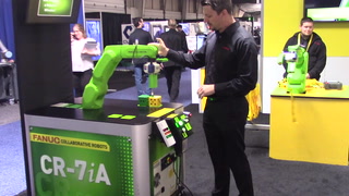 Green is the color of collaboration FANUC America Corporation. Here, Senior Marketing Analyst Joseph M. Baldiga shows off one of the company's cage-free collaborative robots, which can safely work in the same space as humans.