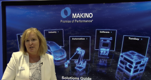 Kimberly Carroll, Makino Inc.'s director of marketing, showcases an interactive digital experience that allowed the company to display its entire fleet of machines at IMTS 2022.